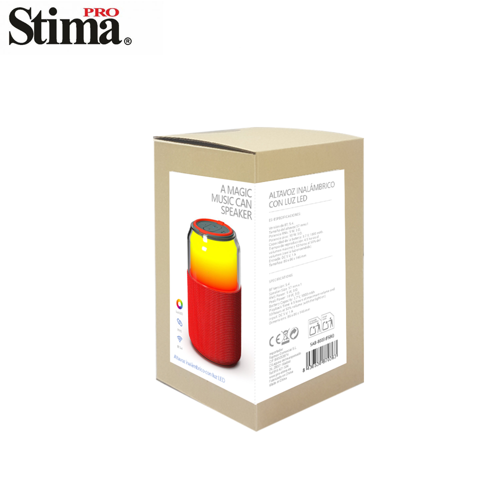 Versión de BT: 5.4. Tamaño del altavoz:57 mmx1 Potencia RMs: 5 W, 3 Ω. Potencia pico: 10 W, 3 Ω. Capacidad de la batería: 3.7 V, 1800 mAh. Tiempo de reproducción: 4,5 horas al volumen máximo y 10 horas al 50% del volumen (con la luz encendida). Entrada: DC 5 V, 1 A Tamañou: 86 x 86 x 146 mm